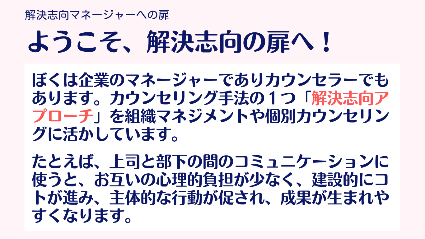ぼくはカウンセリング手法の1つ「解決志向アプローチ」を仕事のコミュニケーションに活かしています。