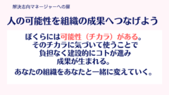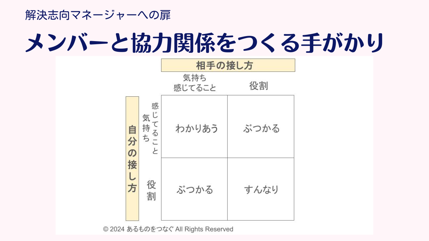 同様に、メンバーも唯一無二の人です。もっとメンバーらしさを知って仕事に活かせるような手助けをしていきましょう。解決志向のコンセプトは「その人らしさ」を引き出すのにとても役立つと思います。