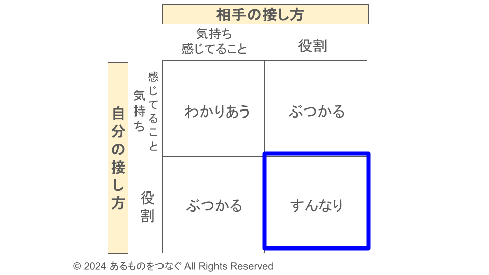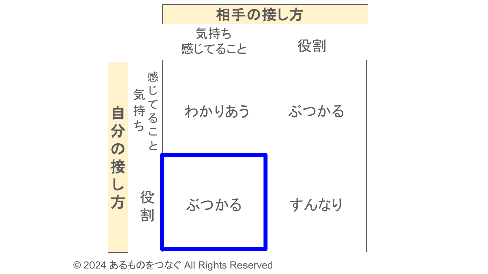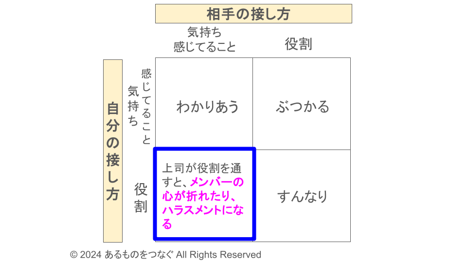 ただ、メンバーが自身の役割をこなす前に、気持ちに余裕がなかったり、家庭の事情があるとか、納得できないとか、役割より気持ちの部分が優位になっていることもあります。そうすると、上司とメンバーがぶつかることがあります。マトリクスだと左下になります。