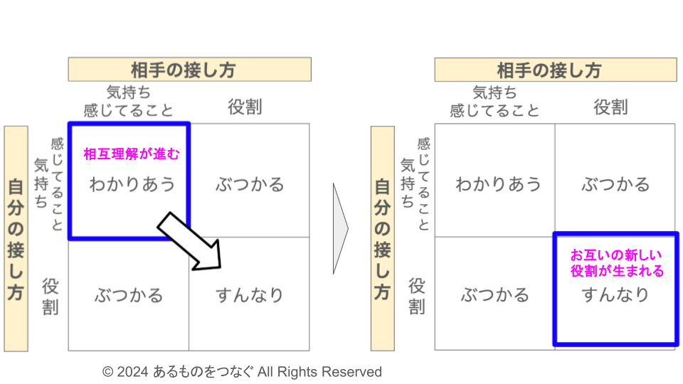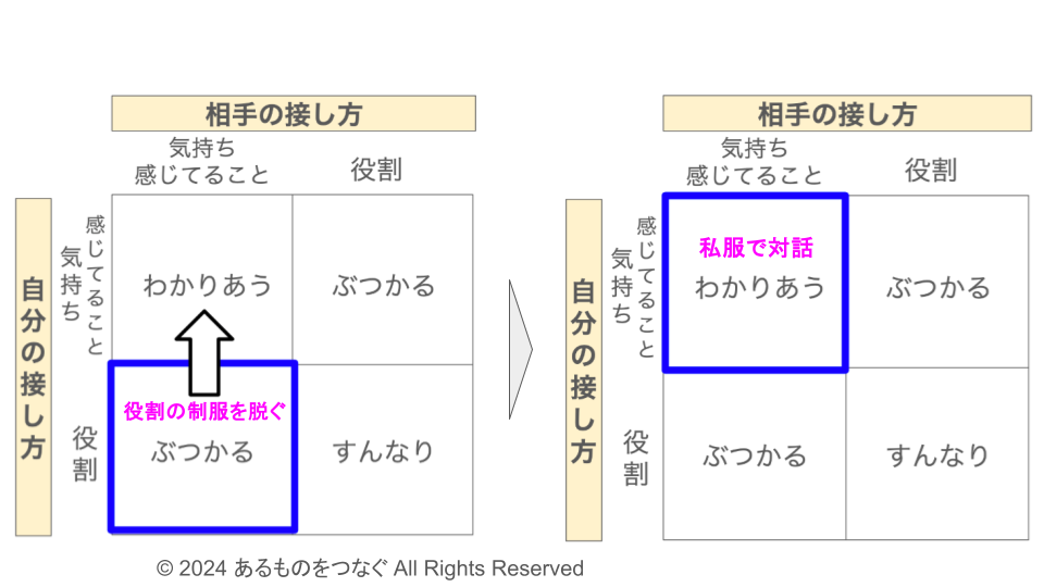 制服を脱いで、私服に着替えて、お互いが気持ちや感じていることをわかりあう。そうして、ようやくお互いがどんな役割をどうやって果たしていくのかを考えることができます。マトリクスでは左上から右下へ向かっていきます。