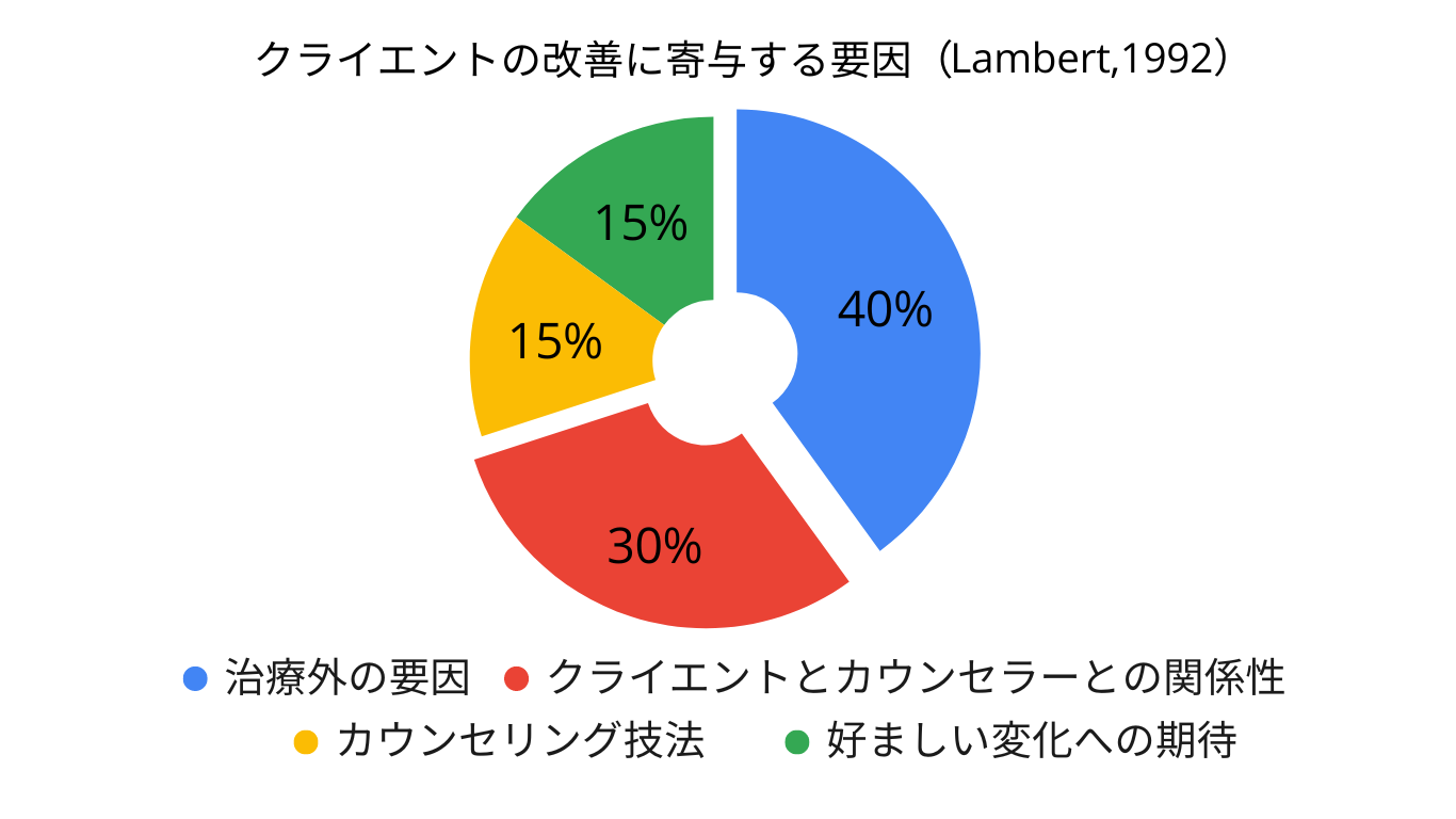 ちょっと古いデータですが、(Lambert,1992)によりますとカウセリングのクライエント改善に寄与する1番の要因は治療外の要因だそうです。つまりカウンセリングルームの外で起きた出来事が治療効果の40%を占めているということです。一方で技法はわずか15%しかないんです。