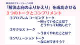 解決志向のふりかえりで、もう一つ大切なことがあります。それは、メンバーが自分なりに考えて行動を起こしたことへの労いや賞賛です。解決志向アプローチではコンプリメントと言います。このコンプリメントをしっかり伝えることで、次の行動を起こしていく意欲につながっていきます。エンパワメントされるんですね。